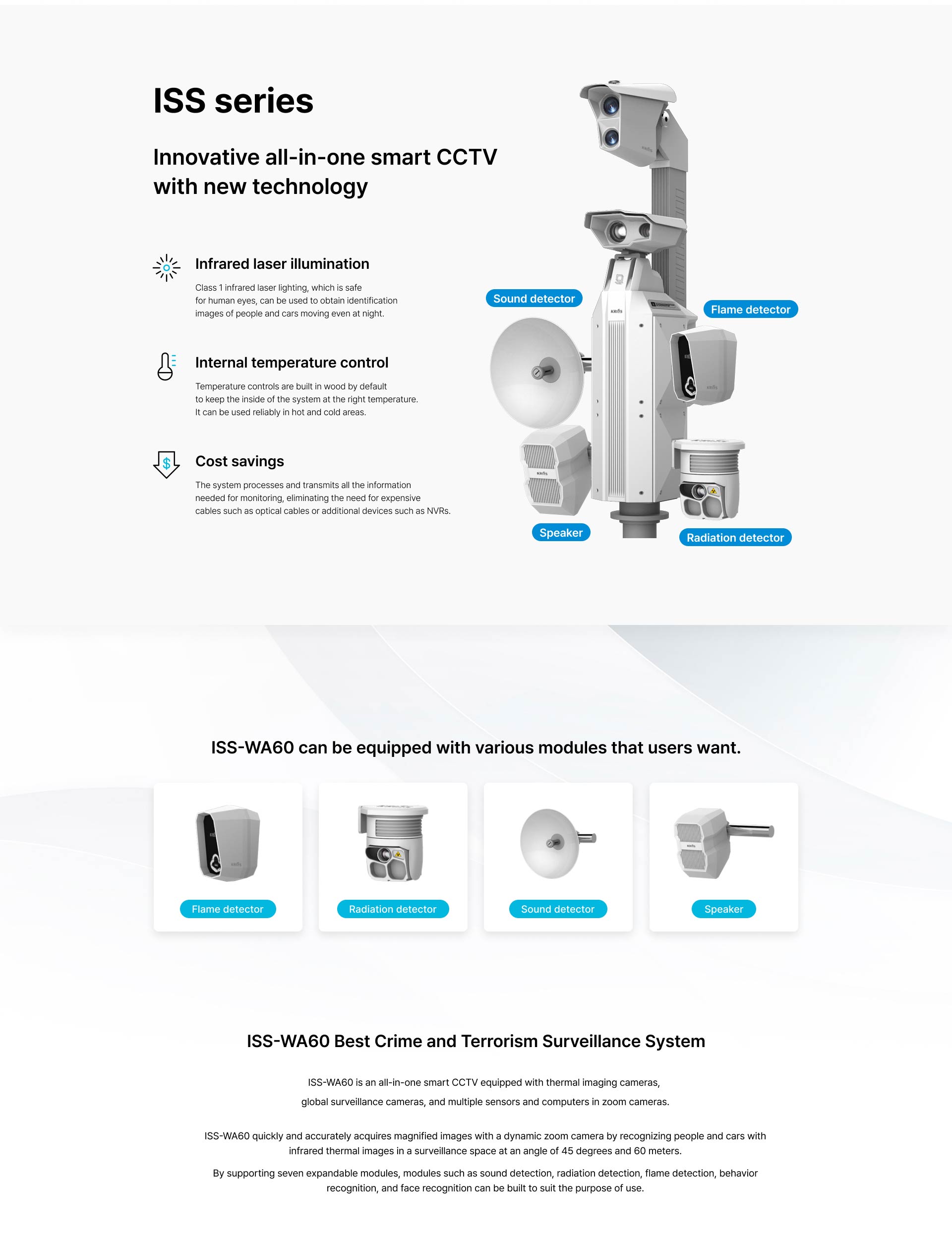 Flame detector provides stable power supply and alarms in case of fire through audio and visual alarms. Can be equipped with and protected by various equipment such as flame detectors, CCTV, and alarm devices. Made of high-quality polycarbonate material with excellent impact resistance, heat resistance, water resistance, and dust resistance. Designed by a professional designer, it provides high aesthetic appeal and ease of construction. Modular structure for easy maintenance and equipment replacement |